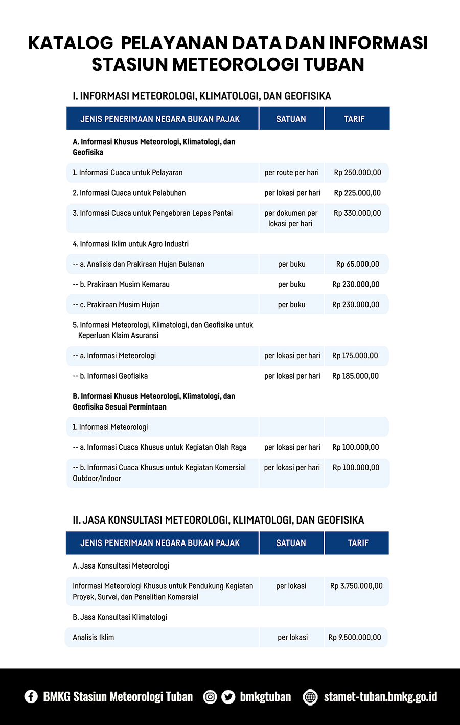 Jenis layanan dan tarif sesuai PP No. 47 Tahun 2018 tentang Jenis dan Tarif Atas Jenis Penerimaan Negara Bukan Pajak yang berlaku di BMKG